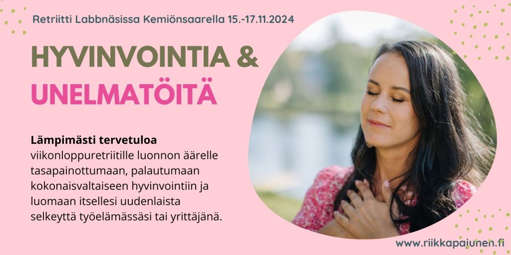 Kiitos Riikka sinun viisaudesta ja elämänilosta ja innokkuudesta, jota saimme osaksi kokea retriitillä. Olet ilmiömäinen puhuja ja löydät aina oikeat sanat joka tilanteeseen. Osaan kannustaa ja motivoida hienolla tavalla. Olet aito ja oma itsesi, arvostan sitä ja sitä että kerrot jaat asioita omasta elämästä. Näin saa hyvää tarttuma pintaa ja huomaa, että sinäkin olet ihminen, vaikkakin todella inspiroiva sellainen! <3″